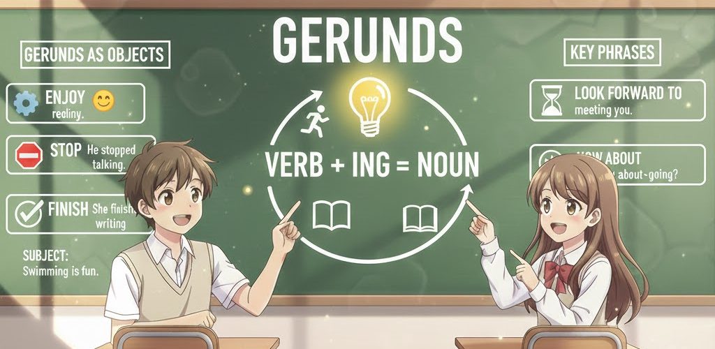 動名詞は、動詞に -ing をつけるだけで作られ、文の中では主語や目的語になります。特に、動名詞しか後ろに置けない動詞を覚えることが、テスト対策の鍵となります。