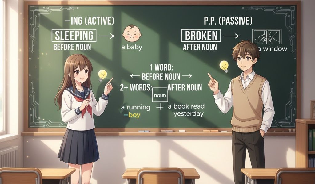 分詞には、**「現在分詞(-ing)」と「過去分詞(P.P.)」の2種類があり、それぞれ「〜している」「〜される」**という異なる意味合いで名詞を説明します。