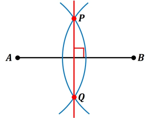 ・それぞれの弧が交わる点をそれぞれP,Qとして、P,Qをつなぐ直線を描く