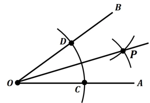・コンパスの針を点Oに置き、線分BO,AOに交わるように適当な弧を描き、それぞれの交点をD,Cとする。