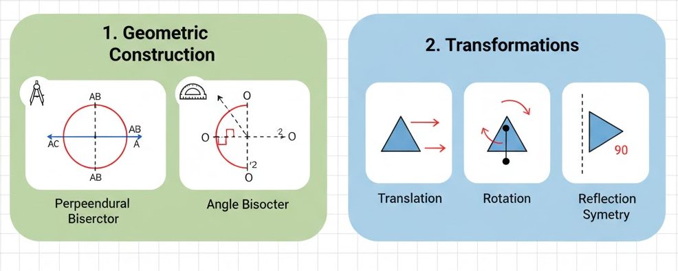 中学の図形では、**定規(まっすぐな線を引くため)とコンパス(円を描いたり、長さを測ったりするため)**だけを使って、正確な図形を描く「作図(さくず)」を習います。また、図形を動かしても形が変わらない「移動」のルールも学びます。