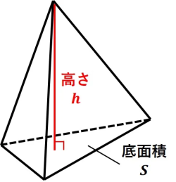 体積 (V) | (底面積) × (高さ) ×1/3 | 同じ底面・高さの柱体のちょうど 3 分の 1 になります!なぜ 1/3 かは高校で学びます。 |