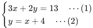 | 2. 代入 | (2)を(1)の y の部分に代入する。必ずかっこを付ける。 | 3x + 2(x + 4) = 13 |