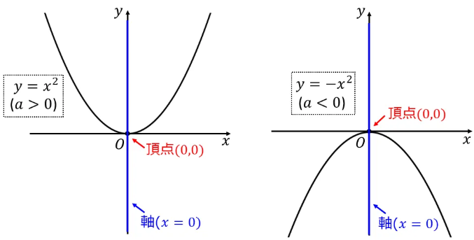 - 原点を通る: x=0 を代入すると、必ず y=a×0²=0 になるため、グラフは必ず原点 (0,0) を通ります。