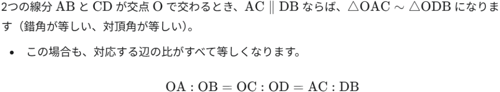 ポイント: 1. は小さい三角形と全体の三角形の相似比を表します。2. は途中の辺が平行線で分けられる比を表し、こちらの方が計算ミスが少ないことが多いです。