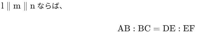 3本以上の平行線が、2本の直線と交わるとき、2本の直線が平行線によって区切られる線分の比は等しくなります。