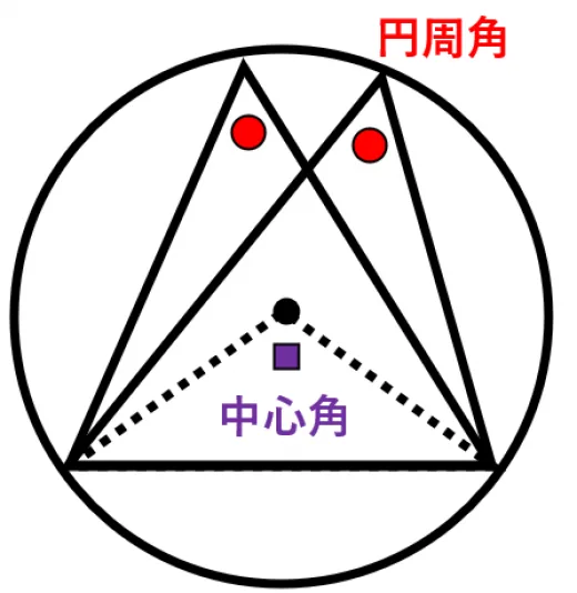 - 円周角(えんしゅうかく): 弧の両端と、円周上の点を結んでできる角。