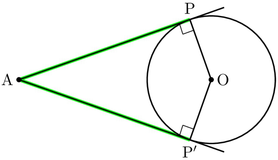 - 例: 点 A から円に引いた接線の接点をそれぞれ P、P’ とするとき、AP = AP’ が成り立ちます。